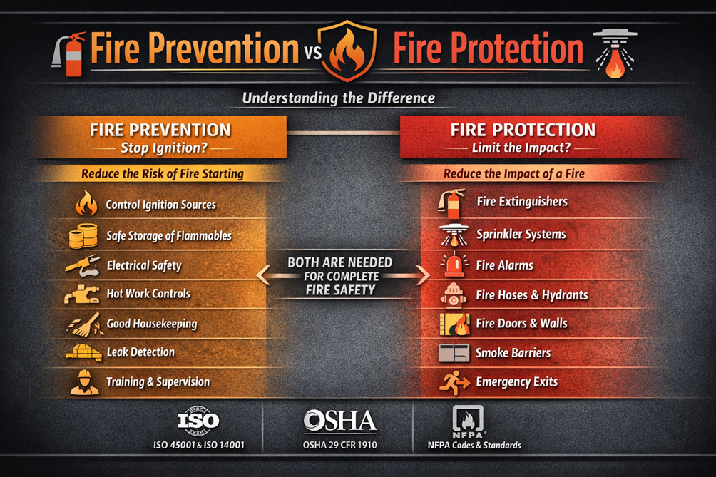 Prevention reduces likelihood. Protection reduces severity. This is fully consistent with the logic of risk management under ISO 45001 and broader safety practice. ISO provides the management framework. OSHA gives workplace requirements. NFPA provides technical design and maintenance standards. Together, they support a complete fire safety approach.